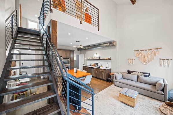 Each apartment offers free laundry units, a dedicate parking space across the street from the building, a queen bedroom, and a full bathroom. Apartments 2, 3, and 4, also have queen pullout couch beds. And apartment 4 has an additional half bathroom. Apartments 1 and 2 are on the ground floor, while apartments 3 and 4 are on the second floor, accessed by the outdoor staircase on the porch. All apartments have access to the backyard garden and seating areas.