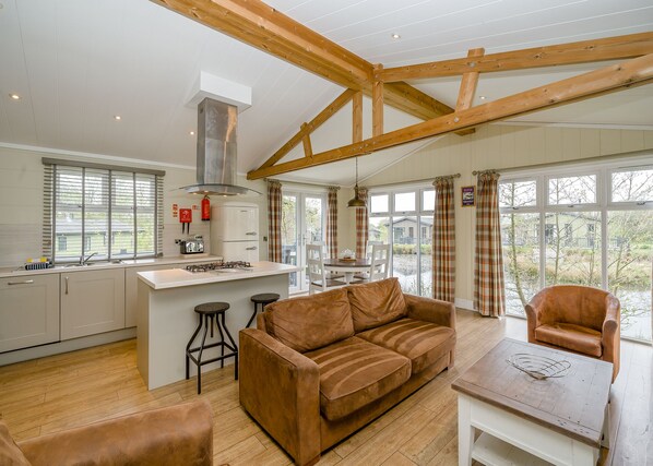 Escape to a luxurious lodge for a relaxing break in the Lakes, where country chic meets comfort. The open-plan living area boasts a large Flatscreen TV and inviting sofas, complemented by an elegant kitchen featuring a breakfast bar and a stylish dining area for delightful gatherings. The master double bedroom offers either a monsoon shower or a bath with a monsoon shower, while the spacious twin room is accompanied by a family bathroom. Open the enchanting French doors and step onto the decking area with outdoor furniture, an idyllic setting for al fresco dining. Interior fixtures and fittings may vary. For those bringing a pet, use the pet filter during the booking process to notify the resort in advance. Immerse yourself in Lakeside luxury, create cherished memories, and let this lodge be the epitome of your rejuvenating escape. Pets allowed in selected accommodations only.