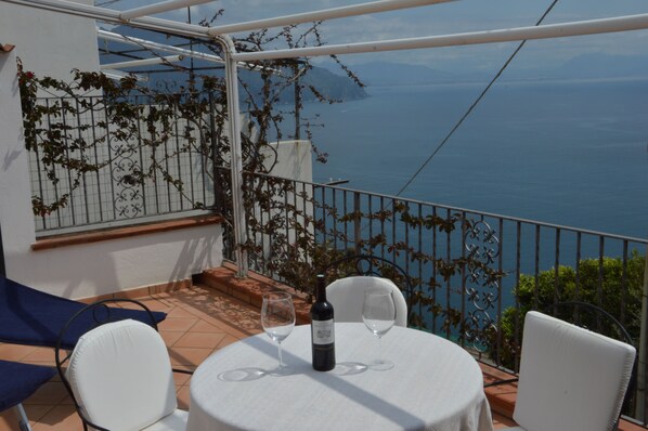 The TERRACE with a view on the Amalfi Coast bay is equipped with 2 deckchairs, a table with a hand-painted ceramic top and 3 chairs. If you decide to come with a car, just at about 50 metres from the stairs that lead to the apartment, there is a private garage free of charge - ONLY upon reservation. From the main road, as mentioned previously, you reach the apartment climbing about 50 picturesque stone steps. The houses of this area are scattered along a narrow road cut into the sloping coast all facing the sea and the sun, separated by thriving vegetable gardens. Here the authentic villagers lead their life with quiet rhythm and without crowds of tourists. Conca dei Marini is the perfect starting point to visit all the most famous tourist sites of the region as the beautiful “Grotta dello Smeraldo” (Emerald Grotto) as well as Amalfi, Ravello, Positano, the islands of Capri and Ischia, Paestum, Sorrento, Pompeii, Herculaneum, Naples.