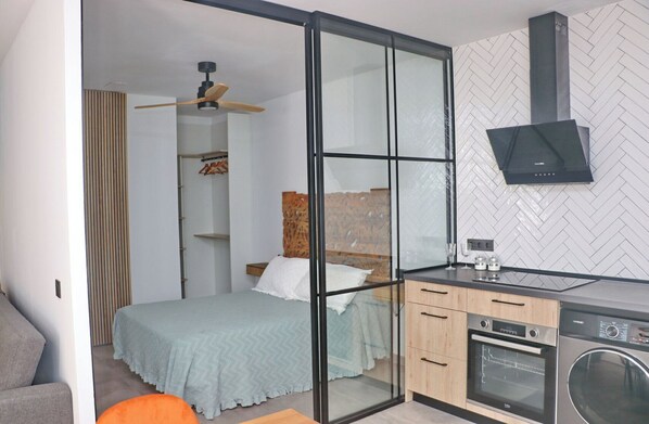 It consists of a bedroom with double bed and ceiling fan, with glass separation of an open space in which is the living - dining room, with sofa bed, air conditioning, Smart TV, Wifi, dining area ... and kitchen area, equipped with everything necessary for the stay (dishwasher, washing machine, microwave, oven, kitchenware .....).