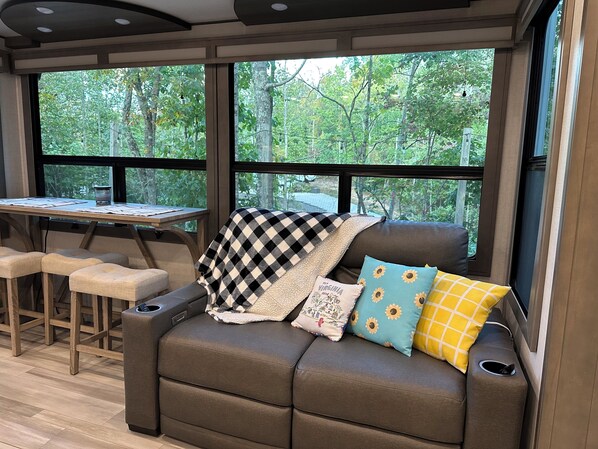 Enjoy a cozy retreat with friends, family or just by yourself without the hassle of towing an RV in this gated luxury RV campground. We have got you covered in our spacious 2-bedroom, 2-bathroom 42 foot RV. Inside has all the amenities of home and nothing lacking: large refrigerator and freezer, 4-burner gas stove with oven, kitchen island for ample food prepping surface, pantry with plenty of shelves, reclining love seat, cafe style dining table, electric fireplace, hideaway TV, a loft area for kids to play or sleep in for extra space. Bedroom 1 offers: