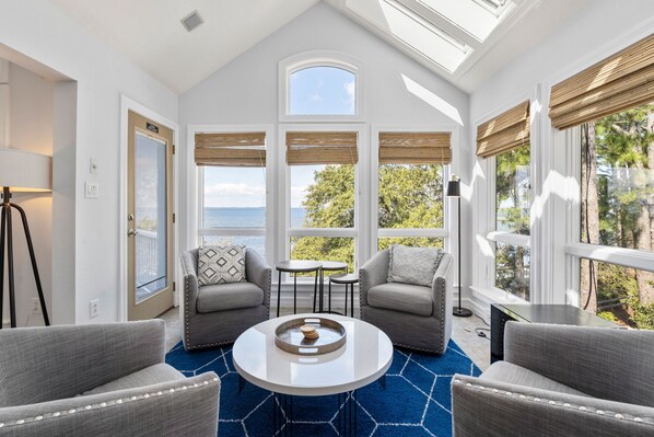 The mid-level consists of four more bedrooms (including a second ensuite), three of which provide direct access to the soundfront covered deck. This 600 sq. ft. shaded outdoor living space includes comfortable lounge seating and a hot tub for soaking away the day while admiring the sunset. In the evenings, watch a movie or the big game in the ground level media room, and use the wet bar for convenient snacks and drinks without having to go upstairs. A shuffleboard table in the garage/game room provides another option for indoor entertainment, along with a full-size refrigerator for storing extra groceries or the catch of the day. The sixth bedroom is also located on the bottom level with an adjoining, semi-private bath. Catch N Relax is equipped with an elevator, ideal for guests with mobility issues. Skip the stairs and use it to send luggage to the upper floors.