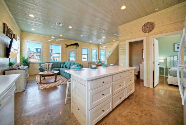 Open the front door to a large dining space, seating for 12, a spacious living room with flat screen TV, a large center kitchen island with bar seating for 4, an extremely well stocked kitchen for prepping, cooking and serving for 12, a laundry room with full size washer and dryer, a door to the back yard space, a guest bathroom and a king suite with a flat screen TV and private en suite bath. The main floor is perfect for those who do not want or can't take the stairs up.