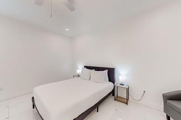 Enjoy the fresh, modern feel of this newly built home, close to everything. The bright, open-concept space boasts marble floors, 10-ft ceilings, and contemporary furnishings. A fully equipped kitchen, comfy queen beds, walk-in glass showers, and in-unit laundry provide all the comforts of home. Stay connected with WiFi, two smart TVs, and a dedicated workspace. Plus, enjoy private outdoor space, air conditioning, ceiling fans, and on-site parking for two cars—your perfect retreat awaits!