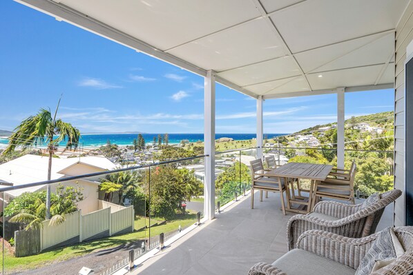 Outdoor living has been enhanced with multiple undercover verandahs at the front, side, and rear, providing a perfect spot to enjoy the sea breezes. With ample outdoor furniture and a full-size BBQ, it's easy to entertain or simply relax. Downstairs, the double garage with remote control access is perfect for storing surfboards or for parking, allowing you to make the most of Crescent Haven's unbeatable location. Just a short stroll to town, you'll have everything you need right at your doorstep for an unforgettable stay.