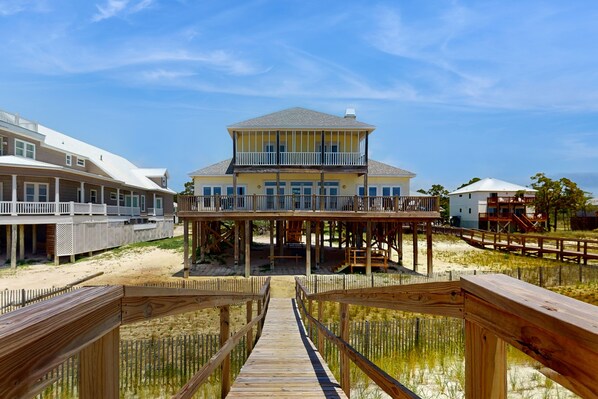 Enjoy a gated beachfront community, and beautiful views of the water from the private deck. The large open great room and huge kitchen make togetherness ideal. A large, partially-covered deck overlooks the beach. Outside two of the upstairs bedrooms, there’s a porch that also overlooks the beach below.