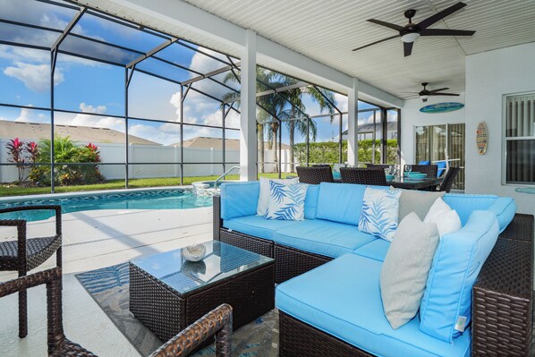 On arrival you will love its front elevation framed by lush tropical landscaping and fresh brickwork paving. A large open plan living area is styled with vaulted ceilings and opens onto a large outdoor pool and entertaining space, that is perfect for relaxation. The garage is setup as a sports bar/games room featuring a pool table, air hockey, foosball, TV and bar area. The 4-bedroom, 3-bathroom property boasts two generous owner’s bedroom suites featuring king-sized beds, en-suite bathrooms with dual vanity units & direct pool access. The third and fourth bedrooms are themed twins and share the third bathroom, which also offers access from the pool area. Key features include A/C & Wi-Fi throughout, 7 smart Roku TVs (full cable, Netflix/Disney etc, one outside), a kitchen featuring Corian surfaces and washer/dryer facilities. Both the indoor and outdoor dining areas comfortably seat eight people and a BBQ is available.