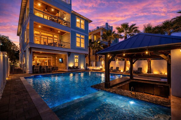Welcome to The Life Aquatic, a luxury getaway curated by Destin Dreamers designed for families and groups seeking a high-end beach experience. Just half a block from the ocean, this premium home features a private heated pool, swim-up bar, hot tub, tiki kitchen, and expansive outdoor lounges—perfect for relaxing, entertaining, or enjoying meals under the Florida sunshine.