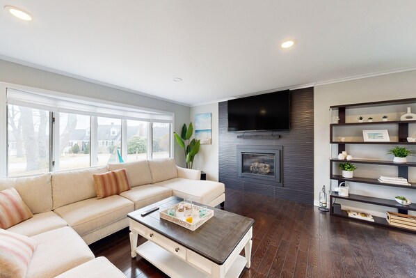 TV, fireplace, video games, ping pong - Waterfront home with firepit, grill, open layout, smart TVs, deck, W/D, & AC (East Falmouth)
