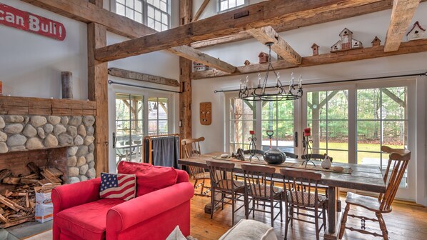 The spacious 4,000 sq. ft. space exudes woodsy charm with wood from a 150-year-old barn frame, wide plank flooring and interior doors.
