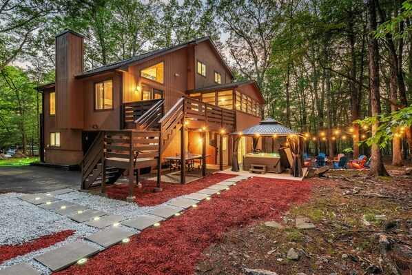 The outdoor space is a great place to relax and enjoy the fresh air surrounded by natural beauty. Whether you're soaking in the hot tub, gathering around the wood-burning fire pit, playing table tennis, or watching the kids enjoy the swing set, there's something for the whole group.
