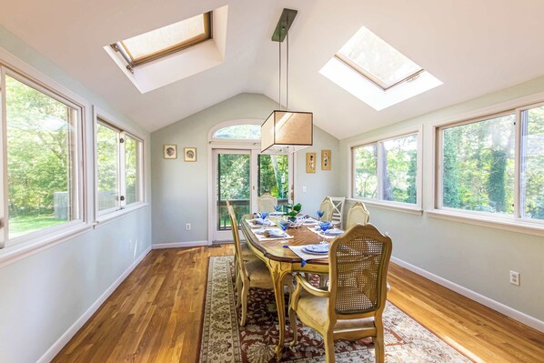 On Cape Cod, Picture This offers a serene getaway in a spacious home. Enjoy the sun-soaked dining room, year-round sunroom with exposed wood beams and natural light pouring in through skylights. Unwind outdoors on the private patio or by the wood burning fire pit.
