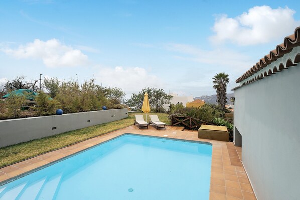 The vacation home offers a private outdoor area with a pool, a garden, an open terrace, a barbecue and an outdoor shower. The terrace is furnished for dining or enjoying drinks with a view.