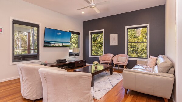 Escape to Seaclusion, a luxurious holiday rental in Elizabeth Beach, NSW. With modern amenities like a fully equipped kitchen and outdoor shower, enjoy al fresco dinners on the covered deck surrounded by lush gardens. Take advantage of Wi-Fi and explore nearby beach activities or simply unwind at this family-friendly haven.