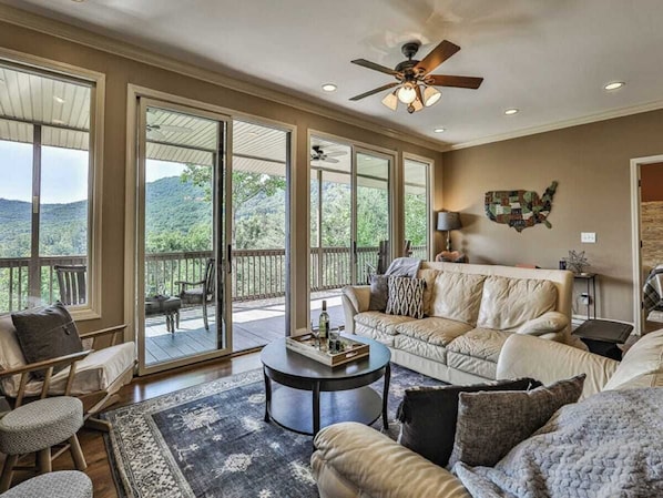 Sunrise Ridge is a gorgeous mountain home with amazing sunrise and mountain views that can be enjoyed from almost every room in the house! The great room has a ceiling to floor wall of glass allowing you to enjoy the views regardless of the weather. The huge covered porch is where you will most likely find yourself hanging out a lot. Imagine yourself just relaxing, perhaps with someone special or enjoying some family time in the fresh mountain air relishing in these mountain views! Keep the camera handy, this is also the perfect spot to enjoy whitetail deer, turkey, hawks, eagles and yes, even black bear!