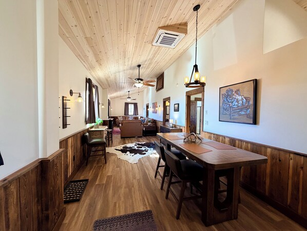 The living and dining areas flow easily into one another, making it easy to gather, cook and relax. Two comfortably furnished queen bedrooms with connected bathrooms are located just off the dining and main living areas to catch a relaxing night's rest. An additional queen sleeper sofa is available in the living room. After a full day of adventure, curl up on the couch, stream your favorite show, or simply unwind and watch the alpenglow over the Absaroka Beartooth mountains. However you spend your time in the mountains, we can guarantee you'll pinch yourself a few times looking at the valley view!
