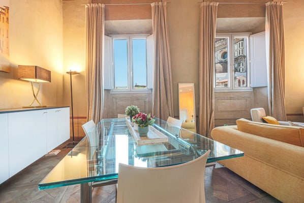 On the ground floor you'll find the spacious and bright living area, with parquet floors, equipped with a comfortable sofa and a glass dining table. From the living room’s window a stunning view of the Duomo will surely enchant you!