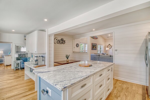 Heaven's Folly features a remodeled interior and exterior, with brand-new bathrooms, furnishings, flooring and bedding. It also has a fully equipped modern kitchen with new appliances, outdoor games, and a putting green. With its ideal location, ample amenities, and proximity to the Ocean, this Folly Beach house is the perfect choice for your next getaway!