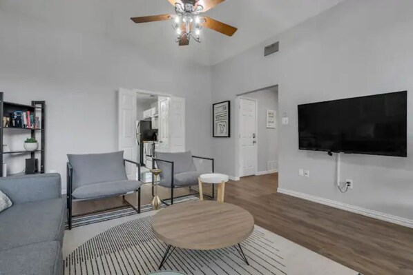 Located in the heart of vibrant DFW, this modern private oasis offers a spacious living area, kitchen, and dining room for you to unwind. Enjoy full access to three bedrooms with neutral decor and Smart TVs or relax in the fenced backyard with cozy patio seating.