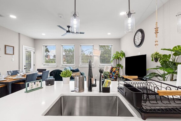 The kitchen area has numerous cooking appliances and spacious countertops. If you want to take a break from restaurants, then this is the place for you.