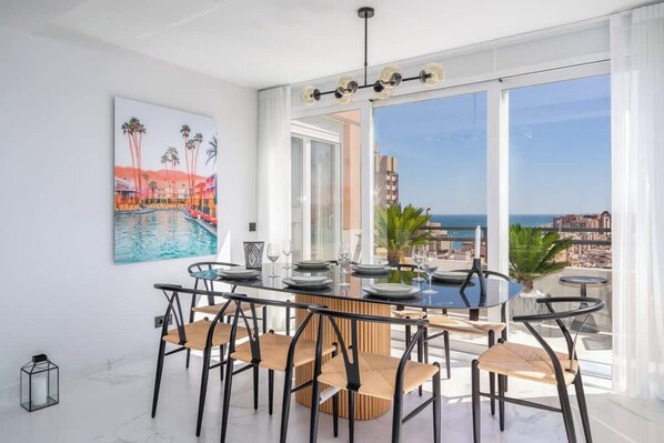 When you open the doors, you are greeted by a top-renovated apartment of the highest standard, where you step into a living room with black accents and modern style. Here you have a comfortable sofa set and a Smart TV on the left, and a dining area with wonderful views of the western Fuengirola skyline. To the right when you enter, you have a fully equipped kitchen with appliances in the highest possible standard. Here is a dishwasher, coffee machine, wine cooler, double fridge and freezer, toaster, and much more.