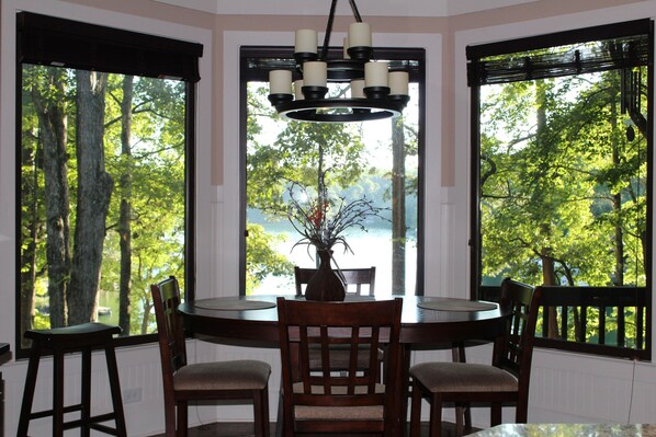 Kitchen featuring Viking appliances and all of the necessities provides you the space to prepare and serve your meals. Enjoy your meals around the farmhouse table in the dining area while listening to the stories everyone is sharing about their day on the lake, or the table located in the kitchen that overlooks the lake through bay windows that causes your food to get cold because the lake, the birds, the view in general, is breathtaking and you do not want to miss anything. #thestruggleisreal.....
