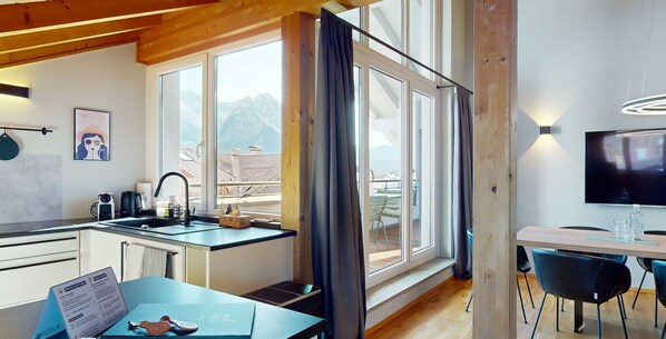 With a total of four spacious rooms, the apartment offers enough space for all your needs. Ample windows flood the rooms with natural light and allow you to look out over the rooftops of the city and far into the mountains. Lots of natural wood, paired with elegant, modern design, result in elegant furnishings and comfortable accommodation where you simply have to feel at home.
