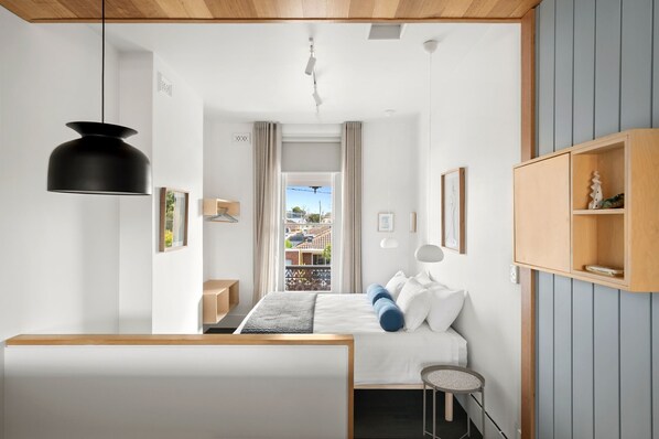 Upstairs, the second bedroom features a king bed, bedside tables, soft lighting, and wardrobe space. Hydronic heating and an air conditioner keep the space cosy.