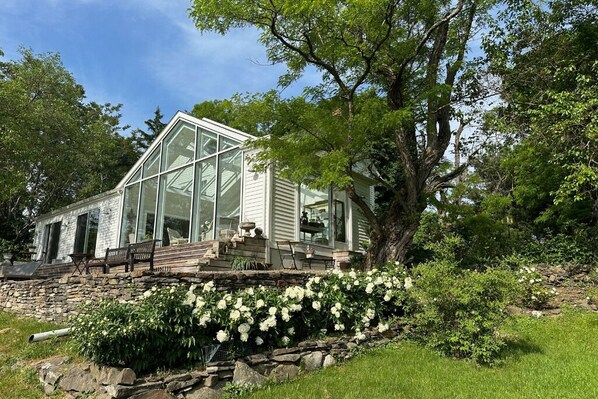 Escape to a classic farmhouse in Germantown, where natural light pours into the spacious living areas and westward views of the Catskills unfold. Relax by the fireplace, explore European eclectic antique interiors, or unwind on the stone terrace surrounded by mature gardens and a cozy fire pit.