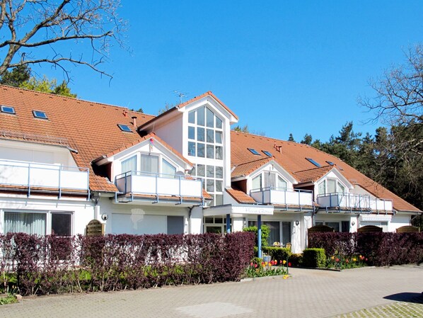 Apartment block. 21 apartments in the residence. 800 m from the centre of Glowe, on the outskirts, 8 km from the centre of Juliusruh, 16 km from the centre of Saßnitz, in the residential district, 300 m from the sea. For shared use: property with trees. In the house: WiFi, washing machine, tumble dryer (for shared use, extra). Parking on the premises. Supermarket 600 m, bus stop "Haltestelle Gasthaus Schaabe" 1.1 km, sandy beach 300 m, indoor swimming pool 6 km. Marina 1 km. The holiday properties may differ in living space, floorplan, equipment and furnishing. Internet access for 1 terminal per flat. Bicycle storage available in the complex.