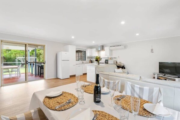 Inside is open plan where the family can spend time together playing games, reading or watching TV in the dining or lounge areas. The kitchen is fully equipped with gas cooktop, electric oven, dishwasher, pantry & fridge with easy access to undercover outdoor areas via sliding doors. The coffee machine and milkshake maker add fun for everyone.