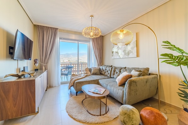 Large apartment in 5 min walk from the beach. (Rare - Ocean view from the bed). Apartment has a great views from both sides to Ocean and Teide. Also, you will see the Airport with all the planes landing and taking-off, however the noise will not bother you, because apartment is far enough away from airport.