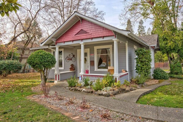 Step into this beautifully maintained 1912 historic home, ideally situated just minutes from downtown Grants Pass—and directly across from a park with a playground, pickleball courts, and a large grassy field. This 2-bedroom, 2-bath retreat blends timeless charm with modern upgrades, offering the perfect space for families, business travelers, and adventure-seekers alike. Dog-friendly with a fully fenced backyard, this home invites you to relax, explore, and stay a while.