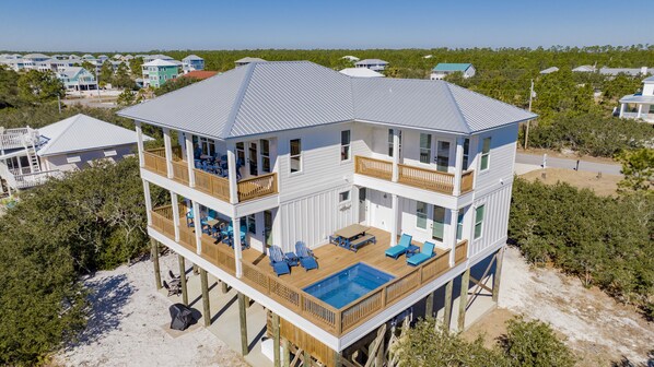 Welcome to Ohana Ocean House - where you'll enjoy GULF VIEWS, PRIVATE HEATED POOL(Additional pool heating fees apply), and a complimentary 6-seat golf cart for EASY BEACH ACCESS! Enjoy 5 BEDROOMS/ 5 BATHROOMS, 3 SOUTH FACING DECKS AND AN ELEVATED POOL! The top level has a spacious open-concept kitchen, living, and dining room. The Gulf-facing wall is all windows and doors and leads out to one of the 3 decks. The fully equipped kitchen has QUARTZ countertops with ample seating at the large Island. The house is equipped with a full-sized refrigerator, dishwasher, and a double oven. The top level also has a King BR suite with a private bathroom, gulf views, and a private south-facing Deck. The 1st level has 4 bedrooms and 4 baths. 3 of these bedrooms have King beds, Ensuite Bathrooms, and private access to the Pool Deck. The 5th bedroom is the custom Bunk room with 2 full beds and 2 twin beds. Steps away from the pool on the second level, there is a morning bar with a full-size refrigerator and sink. The Ground Floor has an indoor entrance stairway with a storage room. An enclosed shower is located under the home and there's ample room for parking under the home. HOME WAS FEATURED ON HGTV IN JUNE 2023.