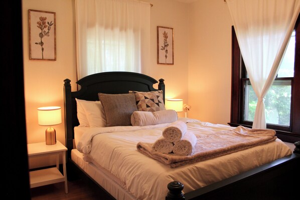 The main floor bedrooms have one queen bed each with soft, comfortable memory foam mattresses and several fluffy pillows. There is a dresser and closet in each room for any storage needs you might have.