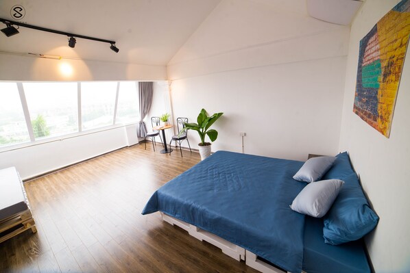 Escape to the tranquil space of EMAM, where natural light and fresh air await on the 5th floor. This spacious suite offers a private hall entrance, comfortable queen-sized bed, and shared bathroom. Enjoy scenic views of Flower Valley from the big terrace or co-working space.