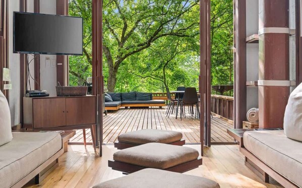 Relax in the grotto-style living area built into natural stone, unwind on the tree-top deck, or explore resort trails and marinas minutes away.