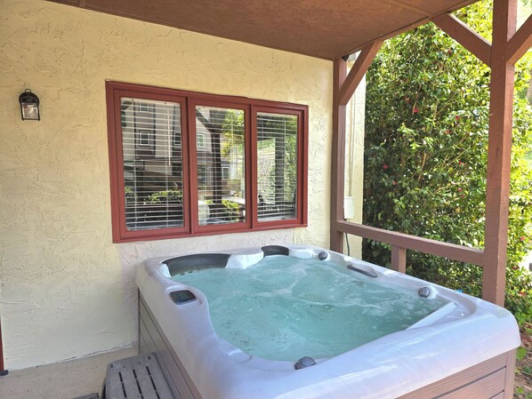The apartment itself was lovely and I appreciated the coffee for our stay. Please consider adding a sign/wreath/decoration to the front dooor that says “Alan’s Apartment “. It was very confusing to find the right door. Beautifully furnished and wonderful bed. It’s difficult for someone with my mobility issues to go up a 10 stair stairway holding onto warped banisters. Though it is on the first floor, that first floor was 1 story up. The hot tub was a nice addition! Please add grab bars or a railing to enable someone like me to easily get in: out. Very gracious.