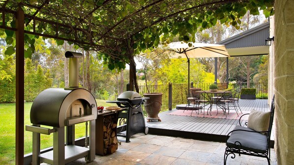Nestled in Hepburn's serene landscape, Noonameena offers a tranquil retreat with an alfresco dining area under a picturesque pergola. Enjoy long lunches and dinners amidst the lush surroundings, warm up by the wood fire or take in the views of Doctors Gully from the peaceful front porch.