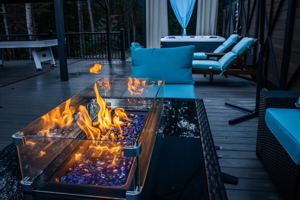 To cap off your evenings, gather around the gas fire table on the deck's lounge area, where the warmth and flickering flames create the perfect ambiance for relaxation.