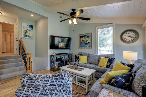 The main floor offers an open, well stocked kitchen with granite counter tops, new appliances, new flooring and modern cabinetry. The dining set for 8 is new along with the furniture in the living area. The living area consists of a couch, loveseat and swivel chair. There is a 55 inch wall mounted flat screen Smart TV and Bluetooth compatible sound bar for your enjoyment. The kitchen slider opens to a deck with a new bistro table set as well as wicker chairs to enjoy the lowcountry beach breezes and vibes!