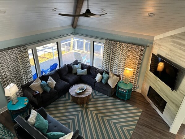 Inside you will find a spacious living room surrounded by windows with spectacular views of the ocean. Relax and take in the amazing views or unwind and watch your favorite shows on a 70-inch HD TV.