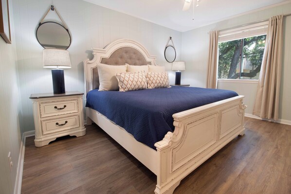 Inside this cozy condo, you will find an open kitchen and living room. It connects to the porch with a view of the lush courtyard. The kitchen is fully stocked with appliances and utensils to create delicious meals with a dishwasher for easy cleanup. The condo can sleep 5 guests comfortably with a King, two twin beds, and a sofa bed. There is one full bathroom with a shower/tub combo. Extended stays are made comfortable with a Smart TV, WIFI, and first floor laundry room. The condo complex has rich foliage with a charcoal grill, swinging bench, and bike rack for guest use.