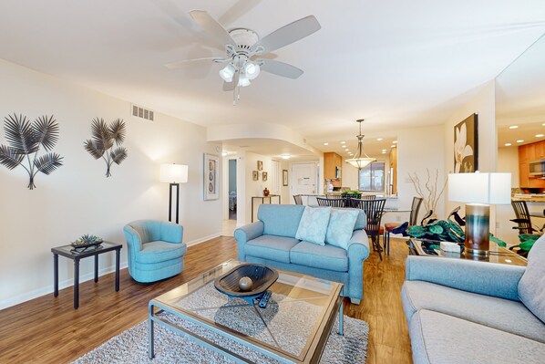 This two-bedroom, two-bathroom villa includes a granite countertop kitchen attached to an open living area, which includes a 32-inch flatscreen TV, brand-new furniture, and access to a large, oceanview balcony. The primary bedroom includes a king bed, a 20-inch flatscreen TV, balcony access, and a bathroom with a walk-in shower. The guest bedroom provides convenient access to the hall bathroom, which is equipped with a shower/tub combination. Both bedrooms are equipped with brand-new mattresses, box springs, and new bed covers. Free WiFi is available for guests, as well as a private washer/dryer.
