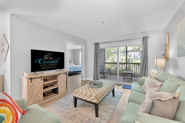 This condo does require walking up stairs to access, but once you enter the condo everything is on one level! The condo was recently updated with new flooring throughout and luxury bathrooms! The coastal décor transports you to paradise for a relaxing stay on Hilton Head. The kitchen is fully stocked and features peninsula seating for 2. Guests can gather around the dining table for meals or play games together! The living room is beautifully decorated with 2 comfortable couches, a smart TV and access to the screened-in patio.
