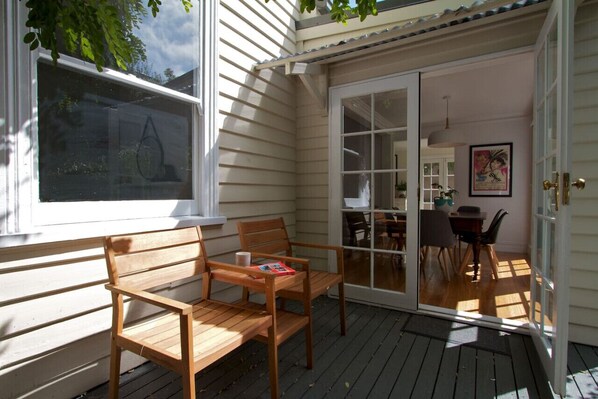 Two queen size bedrooms are easily accessible on the ground floor, and another two bedrooms (one with a queen bed and the other with two singles) are upstairs. Please note that the stairs are steep (in-keeping with the era of the house) so people with mobility concerns are best to occupy the downstairs bedrooms. We have a stair safety gate available when young children are staying.