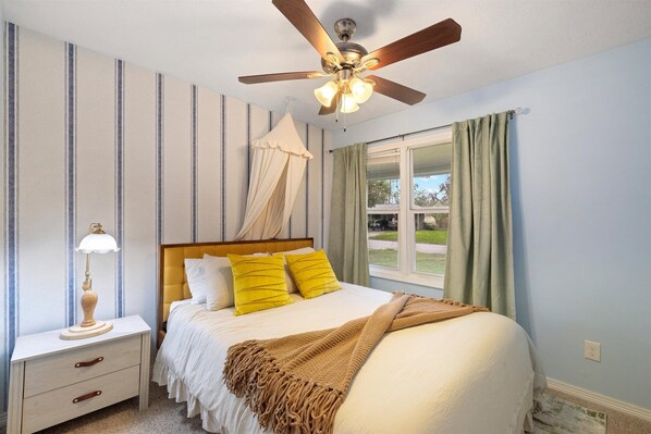 • Second bedroom: Queen-sized bed, bedside table + lamp, closet