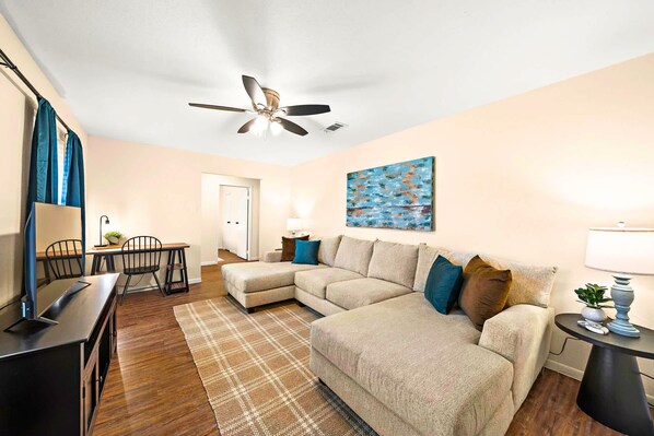 The heart of this cozy Seabrook home is the inviting common area, which includes a comfortable living room and a well-equipped kitchen perfect for group meals.