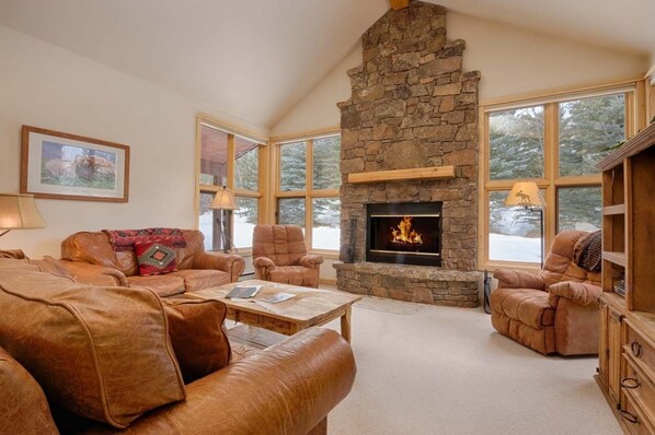 The townhome welcomes with its slate foyer and ground floor amenities including a coat closet, laundry room and garage. A hallway leads to a bedroom with two lodgepole pine twin beds, a TV/DVD player and an ensuite bathroom.