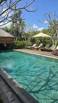 Travelers find tranquility at The Astari Villa & Residence, near Jimbaran Beach. The outdoor pool offers a refreshing escape with sun loungers and umbrellas. Guests can also relax in the garden and enjoy a good book from the property's library.